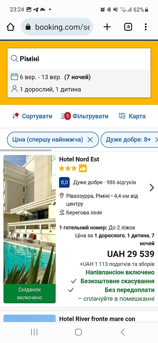 Почему спрашиваю, потому что если не принципиально направление, а главное море. Если бы не была привящана к подруге и выбираоа сейчас, то полетела бы в Италию (там еще не была), если хошие билеты в Форли, от туда недалеко до Римини, адреатическое море и адекватные цены на жилье. Вот к примеру это на 6-13 сентября. Второй вариант гостиницы (дороже) - это завтраки и ужины.