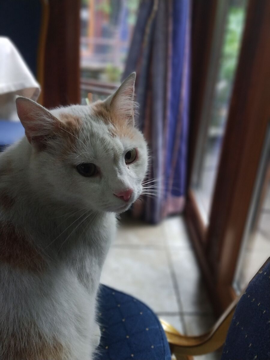 Разумеется угостили, погладили. Официант сказал, что его кормят, и идёт он не ко всем, а как-то понимает, кто будет ему рад, и разу не прогоняли кота люди, значит умеет выбирать.