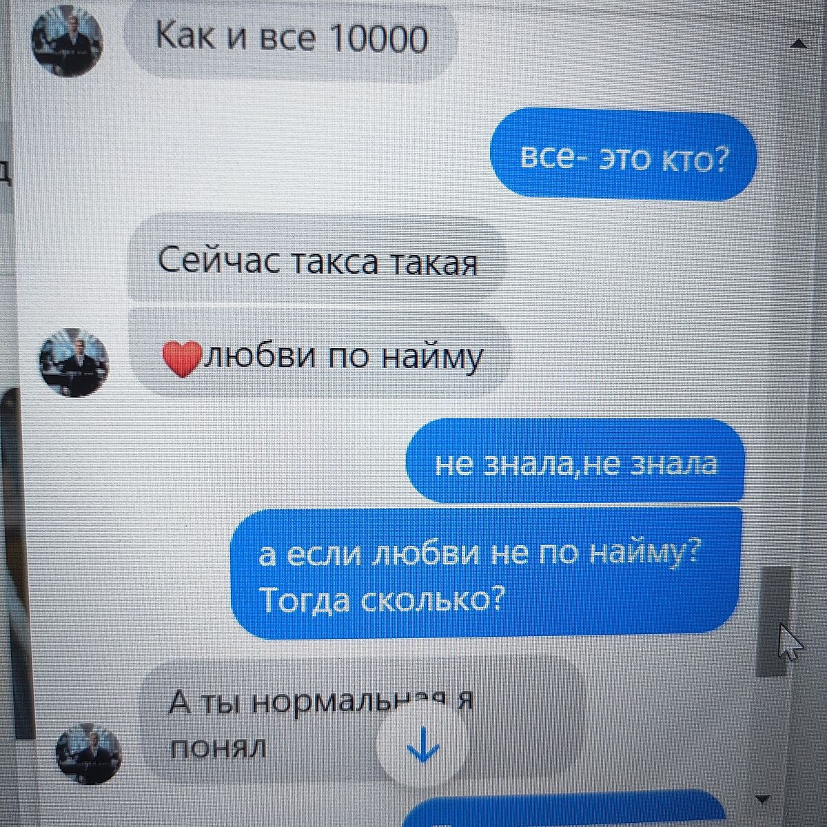 Пишет один из на ФБ,ну там в переписке видно🤣 Оказывается сейчас такса 10000 за ’любовь по найму’.Повеселил,конечно.