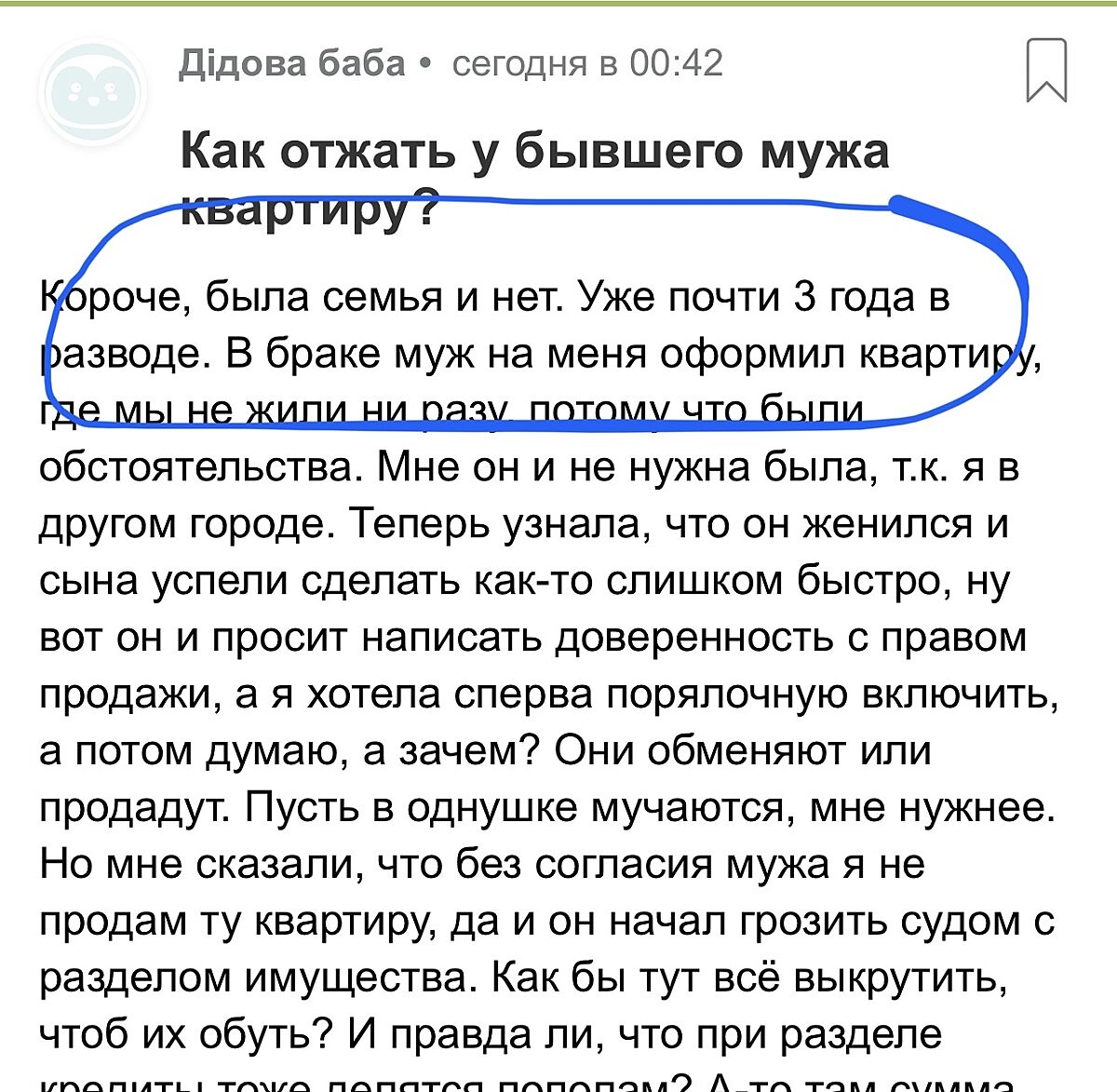 Короче, была семья и нет. Уже почти 3 года в разводе. В браке муж на меня оформил квартиру, где мы не жили ни разу, потому что были обстоятельства. Мне он и не нужна была, т.к. я в другом городе. Теперь узнала, что он женился и сына успели сделать как-то слишком быстро, ну вот он и просит написать доверенность с правом продажи, а я хотела сперва порялочную включить, а потом думаю, а зачем? Они обменяют или продадут. Пусть в однушке мучаются, мне нужнее. Но мне сказали, что без согласия мужа я не продам ту квартиру, да и он начал грозить судом с разделом имущества. Как бы тут всё выкрутить, чтоб их обуть? И правда ли, что при разделе кредиты тоже делятся пополам? А-то там сумма большая, не хотелось бы вляпаться.