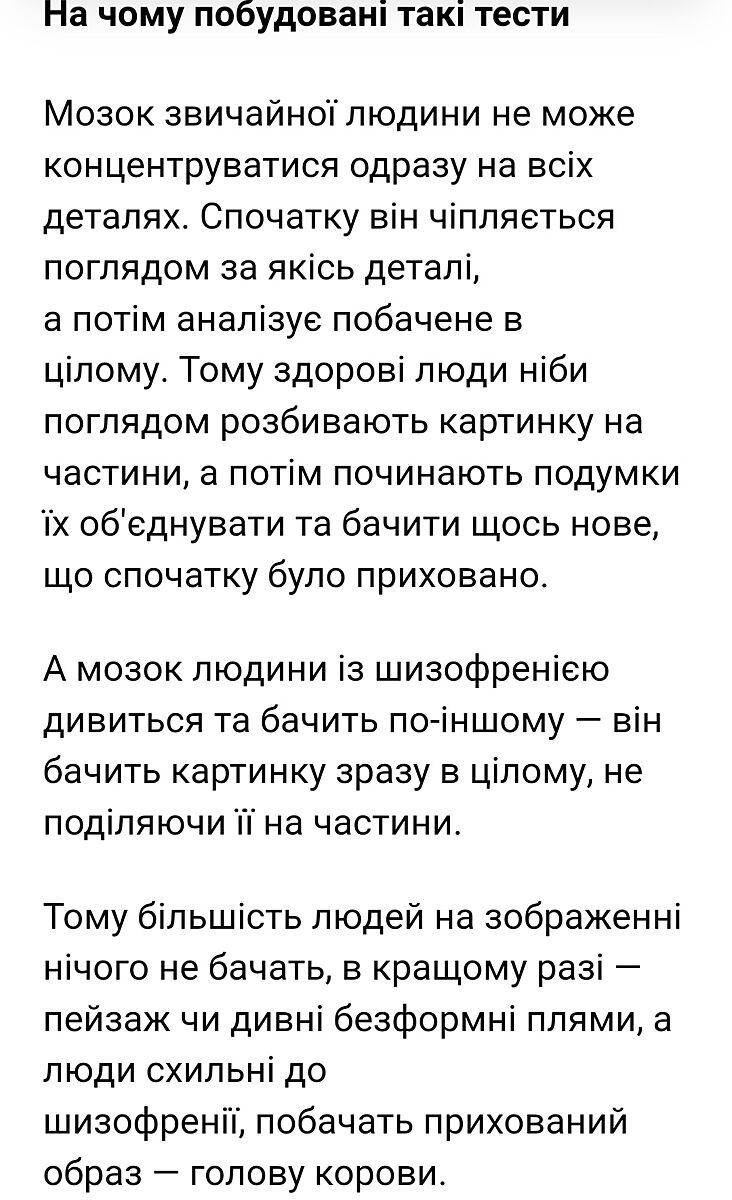Отже, якщо впродовж хвилини розглядування, ти побачив плями пейзажу, чи нічого не побачив, засмучуватися не потрібно, тому що це означає, що схильності до шизофренії не має.
