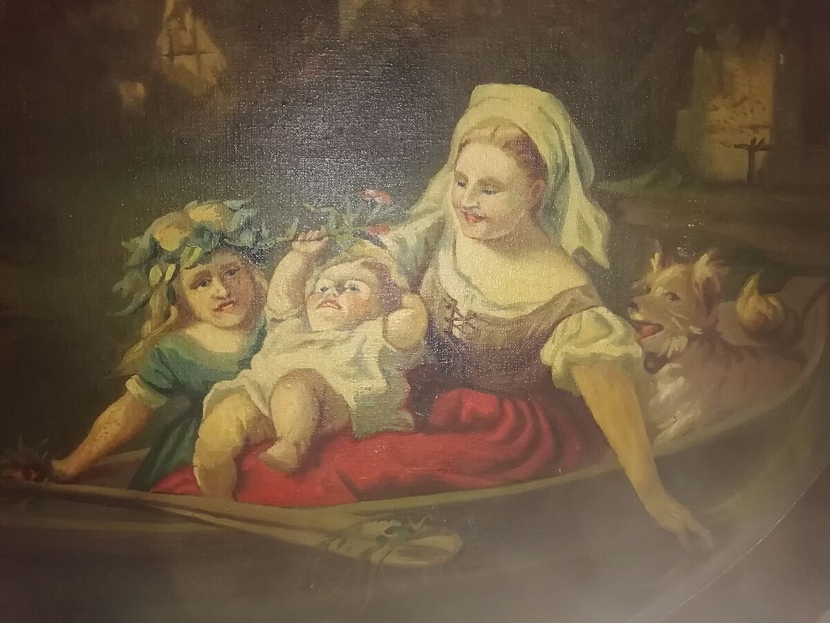 Сімейна ідилія. Жанрова сценка фламандського художника про дозвілля сім’ї того часу. Прогулянка на човні всією сім’єю. Батько спокійно і впевненно веслує дивлячись на своїх улюблених діток і жінку. Старша дитина-дівчинка в романтичному вінку із ніжних білих квітів і в легкому голубому платтячку, які символізують дитячу чистоту. погляд дівчинки задумливий з легкою посмішкою на вустах. Вочевидь її думки витають в дитячих мріях. Жінка бавить маньшу дитину і вони весело сміються. Символічно у меньшої дитини в ручках над голівкою рожева квіточка, що вказує на стать дитини - дівчинка. Зоображення собаки в човні позаду жінки і дітей символізує охоронця, друга і члена сім’ї, що додатково підкреслює основну ідею автора зообразити на картині щасливу дружну сім’ю. Навіть зоображення і підбір красок і акцентів - центральні, немов осяяні світлом фігури на темному фоні сутінок наводять на думку гладача про світло, радість і любов, які панують у цій родині.