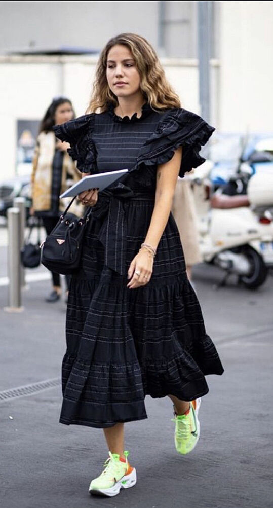 Кросівки, ще й такі акцентні можна носити з будь-чим. Від плаття до джинсів. А от зі спортивним костюмом поєднувала лише якщо є потреба. В цікавих образах можна часто побачити мікс стилів.