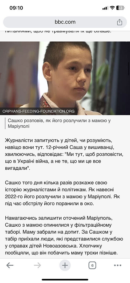 "Сашко того дня кілька разів розкаже свою історію журналістами й політикам. Як навесні 2022-го його розлучили з мамою у Маріуполі. Як під час обстрілу його поранили в око.