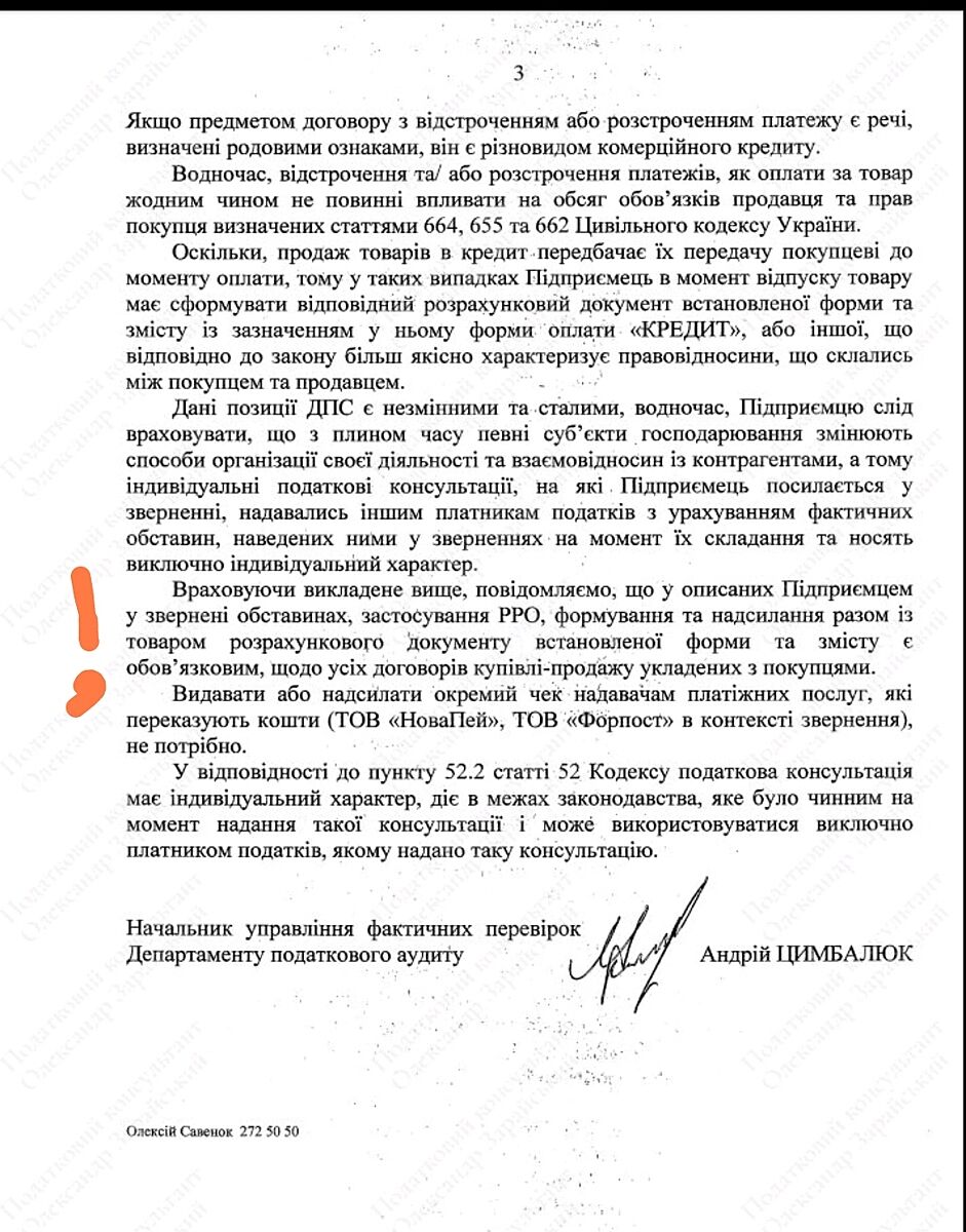 «Враховуючи викладене вище, повідомляємо, що в описаних Підприємцем у зверненні обставинах застосування РРО, формування та надсилання разом із товаром розрахункового документу встановленої форми та змісту є обов’язковим щодо всіх договорів купівлі-продажу, укладених із покупцями».