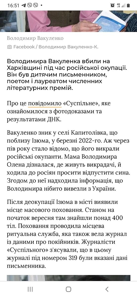Тут доречно буде згадати про розстріл росіянами дитячого письменника Володимира Вакуленка на Харківщині під час окупації. Він самостійно виховував сина-аутиста.