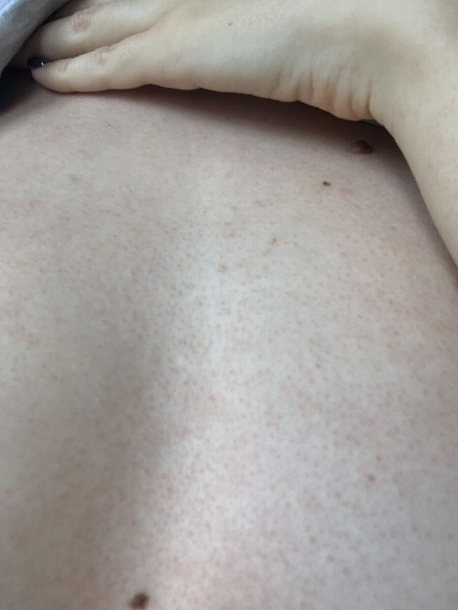Вчора вранці помітила, висипання на руках (до ліктя) і трохи на грудях. До вечора розповсюдилося на плечі та трохи на живіт.