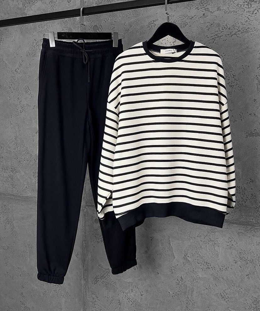 Нравится такой свитшот, но хотелось бы чтоб брюки были палаццо. Может кто-то видел на сайтах, где можно заказать чтоб и свитшот полосатый и брюки к нему, но ровные?