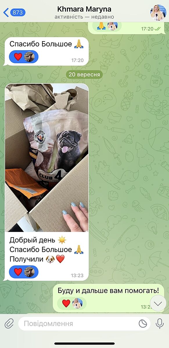 Скрин моего сообщения, где я это писала. Я жду. К Бабинецкому приюту не имею никакого отношения, кроме того, что регулярно помогаю им деньгами и кормом. Основательница приюта - Марина Хмара
