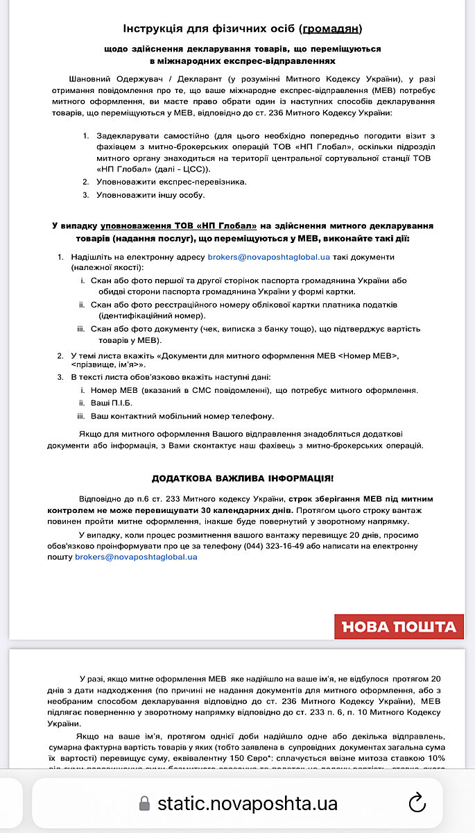 Посылка на таможне, новая почта прислала смс: «Shanovnyi klient! Mytne oformlennya posylky potrebue dodatkovih dokumentiv. Detali