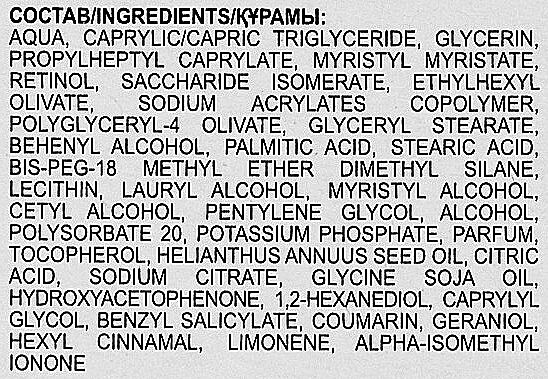 Ретинол, кислоты. Не самый активный крем, если ищете именно ретинол, то тут будете долго эффекта ждать
