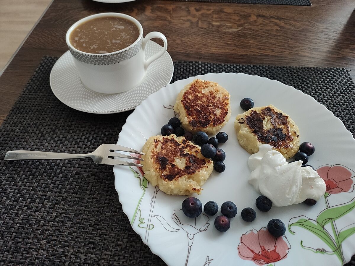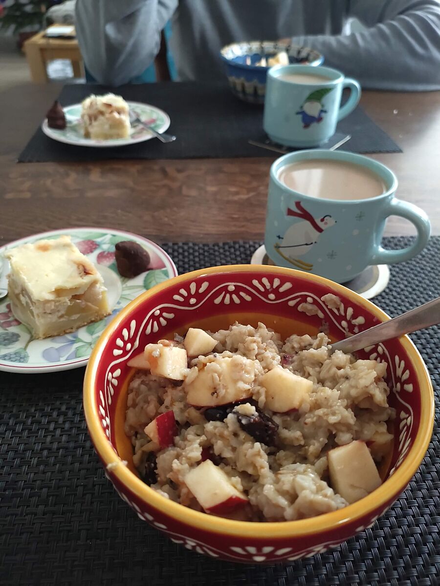 Кофе с запеченным яблоком, или с другими фруктами/ягодами. На обед и ужин обычная еда.