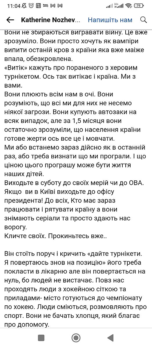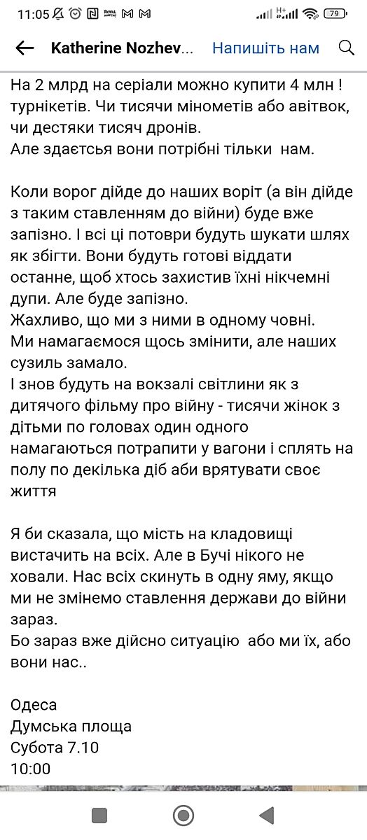 Об этом надо было думать раньше. Когда я в самом начале, еще когда была возможность и была связь, писала что это война ни к чему не приведет , надо требовать переговоров, люди гибнут сотнями в моем городе, мне отвечали что я матрешка и пишу с раши. Легко быть патриотом , пока чужие люди гибнут и чужие города разрушают. Когда оказалось что каждой семье прийдется сделать вклад в эту победу, не получиться отсидеться за чужими спинами , риторика поменялась. 5-6 лет войны и раша выведет свои войска сама. Но всем прийдется кем-то пожертвовать, отсидеться не получится. Если в начале войны большинство выбрало воевать до последнего, то уже надо идти до конца.