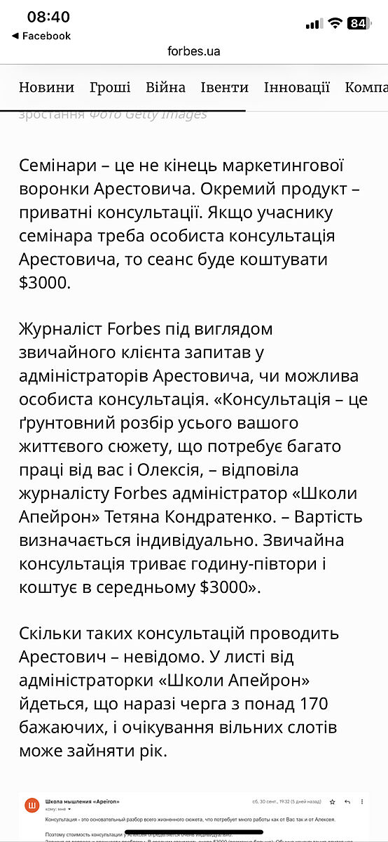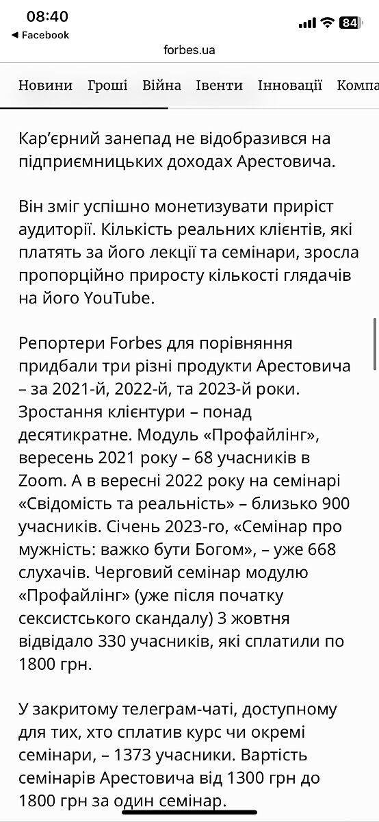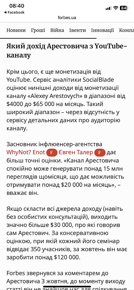 Якщо скласти всі джерела доходу (навіть без особистих консультацій), виходить значно більше $30 000, про які говорив сам Арестович. За консервативною оцінкою, при якій кожний його семінар відвідає 350 учасників, за жовтень він має заробити понад $120 000.