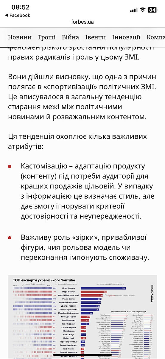 Українське видання Texty опублікувало дослідження – огляд найпопулярніших експертів українського YouTube. Він переважно складається з фальсифікаторів експертизи, політично заангажованих спікерів або торговців дешевими емоціями страху, відчаю чи ейфорії, зазначає консультант зі стратегічних комунікацій Юрій Богданов. Forbes Ukraine попросив його пояснити, яка причина такої пристрасті українців до псевдоекспертизи та чи можна з цим боротися