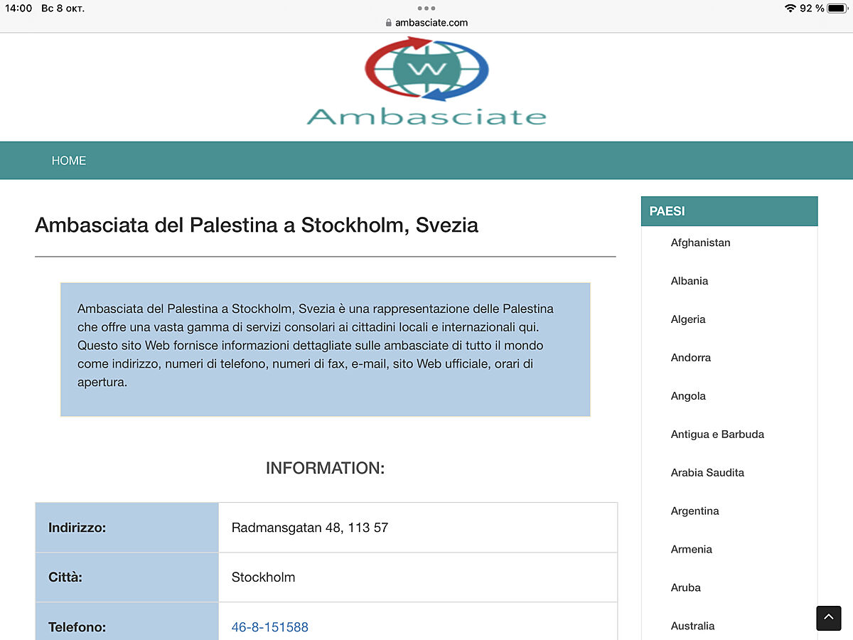 Вот Вам адреса Посольств Палестины, как пример, в Италии и Швеции.