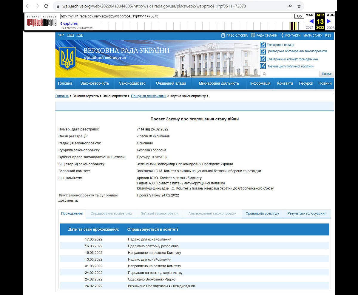 24 лютого 2022 року Верховна Рада України одержала Законопроект 7114 про оголошення в Україні стану війни.