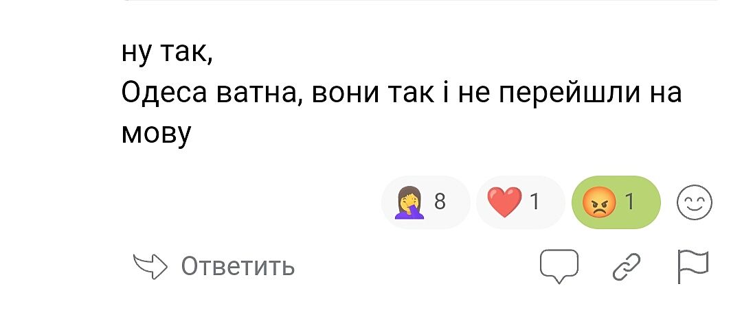 Доречі, щоб не казали ті пришелепкуваті про мову, в Одесі багато населення розмовояє українською, і я в тому числі часто спілкуюся українською. Була в Києві і щось не помітила, щоб там українською спілкувалися більше, ніж в Одесі. І взагалі закрили би рота ті шкури, хто вважає Одесу сепарською. Бо самі вони такі, що ще гірше за русню, як таке кажуть