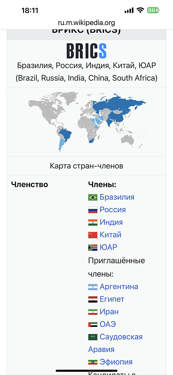 BRICS — сокращение от Brazil, Russia, India, China, South Africa) — межгосударственное объединение, союз пяти государств: Бразилии, России, Индии, КНР, Южной Африки. Приглашены к присоединению с 1 января 2024 года Аргентина, Египет, Иран, ОАЭ, Саудовская Аравия и Эфиопия, тогда число членов увеличится до одиннадцати.