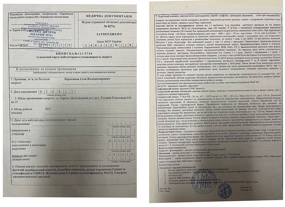 Я, Рудько Марина, мама синочка Ларченкова Ілюші, з ДЦП , імунодефіцитом та іншими супутніми захворюваннями. Хлопчик не ходить. Ілюша народився на 30 неділі вагітності, сталося відшарування плаценти. Довгий час ми провели у реанімації , потім у перинотальному центрі. У рік йому поставили діагноз ДЦП, почалися постійні масажі, реабілітацї, лікарні. Також за цей час зроблено 2 операції, попереду ще велика операція на ніжках.