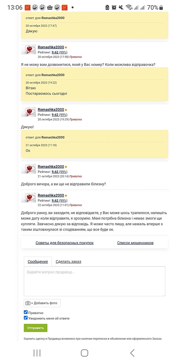 Вітаю! Допоможіть, будь ласка, як бути у ситуації, коли не відправляють товар. Профіль з великим рейтингом. Зробила оплату, дівчина заходить на свою сторінку, але нічого про відправляє, на питання не реагує.