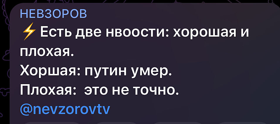 Я вот всегда недоумеваю от того как люди наши с нетерпением ждут смерти путьки. Ну вот умрет он, например завтра . Я не очень верю в двойников , но допустим найдут двойник и зомбо стаду своему будут втюхивать его пока будут думать что делать . Или не будут искать двойник , просто стаду какое то время не скажут, что царь умер . Вы , радующиеся и верящие этим вбросам серьезно думаете , что с его смертью моментально война закончится ? Нет.. потому что последователей у пути очень много и они продолжат «правое дело» вождя . А зомбо стадо как обычно схавает что так значит надо ..