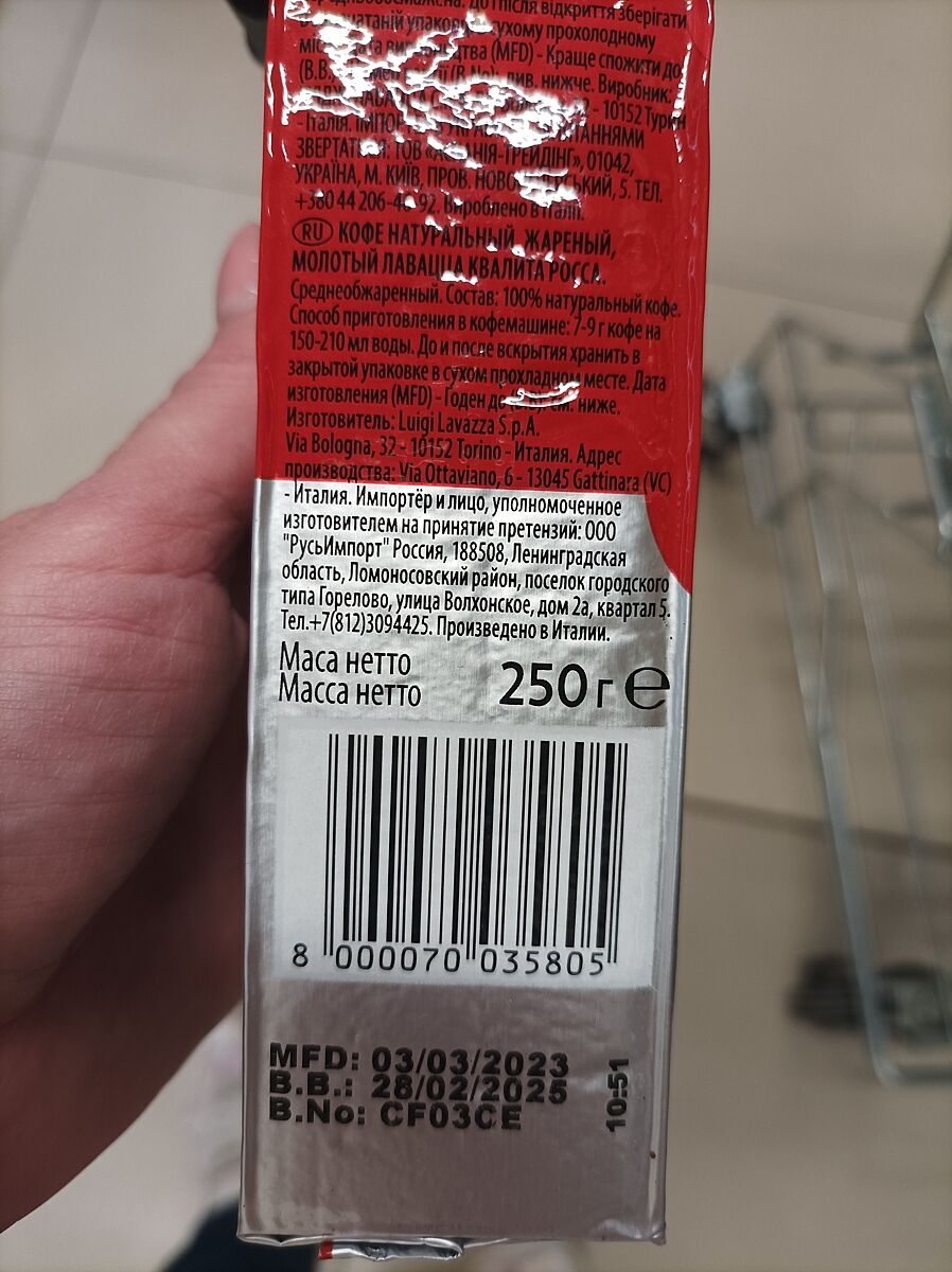 Якщо виникають питання импортера, то дивитесь на штрихкод. Це європейський штрихкод. Упаковку для економії роблять на декільках мовах. Але це означає, що виробник продовжуе продавати свою каву в рашку.
