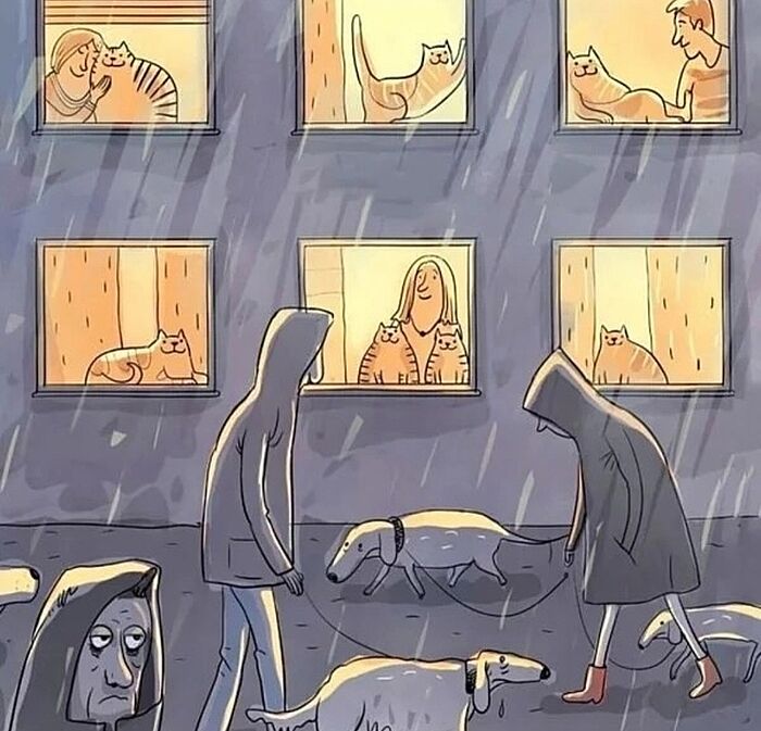 В непогоду ми гуляємо 15-30 хвилин. Я би подумала, що може дійсно щось не подобається в прогулянках, але собака активна весь час на вулиці, коли робимо коло і обходимо будинок - не спішить додому. У всьому одязі рухається вільно