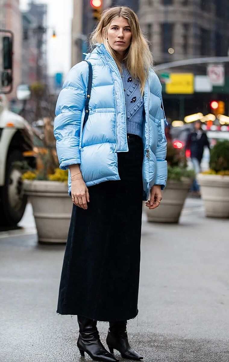 Пуховик сюда не идёт, странный цвет, пропорции из-за длины свитера нарушены