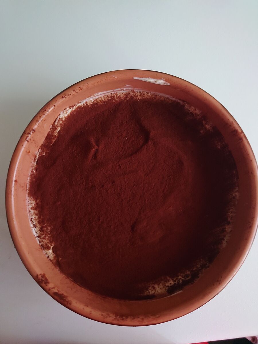 Беремо савоярді, швидко вмочуємо на1 секі викладаємо в перший слой, зверху крем. Ще один такий слой. Зверху какао.