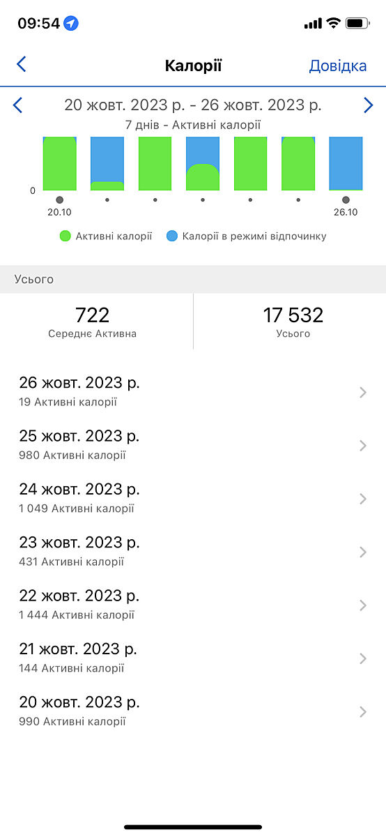 Я поставила собі за ціль витрачати 800кКал. Вчора була прогулянка на 5 км, тренуванн невеличке і просто рух вийшло 770 кКал. Алеж я так гуляю і тренуюсь не кожен день. Зазвичай може бути і 500 і навіть 400. А як у вас скільки кал тратите на день?