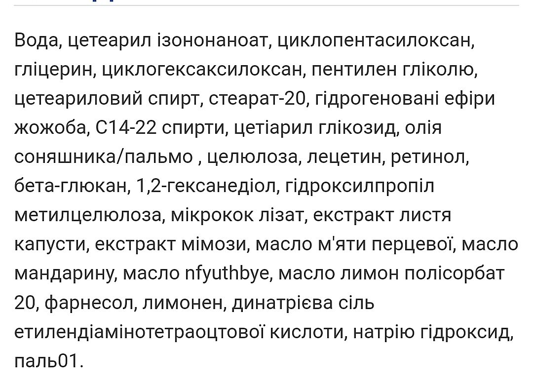 Aqua with infusions of Emblica officinalis Fruit Powder, Azadirachta indica leaves powder***/Вода з екстрактами індійських трав (Амла, Нім)*, Glycerin***/Гліцерин, Decyl Glucoside**/Децил глюкозид (ПАР з кокосової олії), Sorbitan Caprylate,1.3-Propanediol and Benzoic Acid**/ Сорбітан каприлат і Пропандіол і Бензойна кислота (рослинний консервант), Hyaluronate acid***/ Гіалуронова кислота, Retinol/ Вітамін А, Eucalyptus Extract *** (екстракт евкаліпту), Panthenol***/Д-пантенол , Cocos