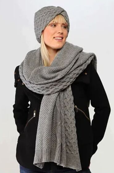 Серая трикотажная шапка и шарф. Сейчас ношу розовую шапку дочки и платок,где есть такой же розовый цвет на синем фоне.