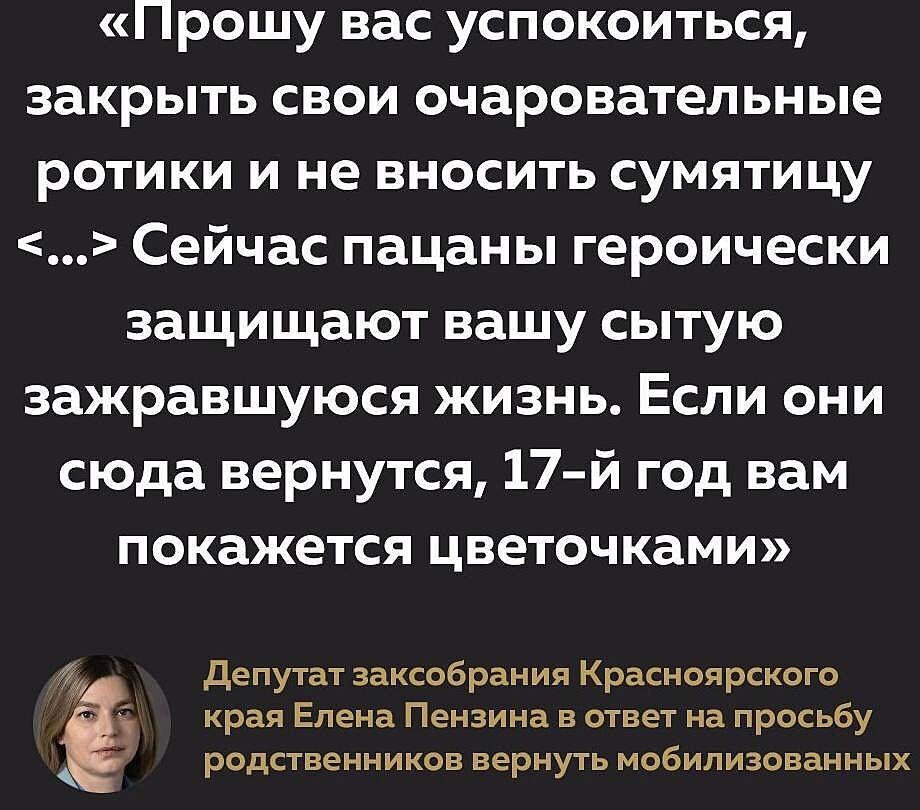Це короче депутатка відкрито написала самкам «героїв сво», що їхні чоловіки і сини не повинні повернутись, бо на парашці почнеться 1917 рік.