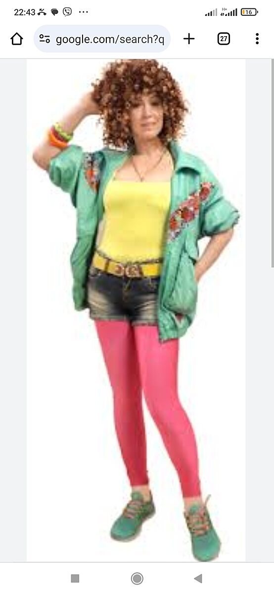 Колготки яскрава сітка шорты або джинсова спідниця , якщо лосін не має . Якась яскрава блуза ,.або футболка з діснеївськими міккі. Джинсовые куртка якщо є. Думаю це просто знайти може щось є в гардеробі. Яскравий макіяж. Сережки якісь великі. Браслети