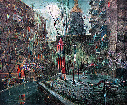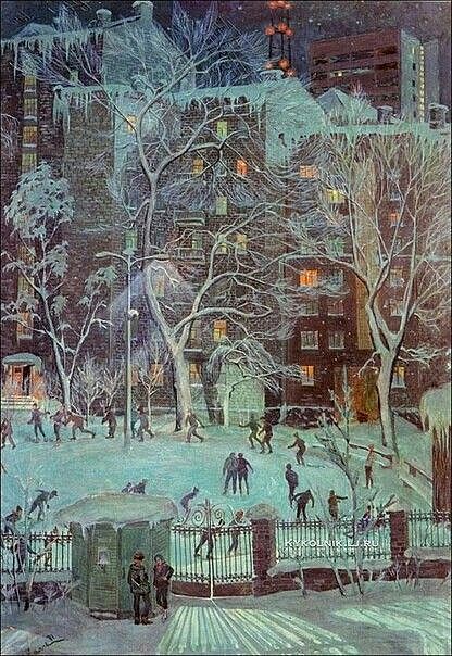 Так, у Євгена Лушпіна класні вечірні картини) теж подобаються, такі затишні. В цій темі з ковзанкою картина Самуїла (Семена) Каплана, він з Києва був, але потім переїхав до США, де помер в 2021 році у поважному віці. В Каплана теж чимало картин з вечірнею темою саме київських двориків