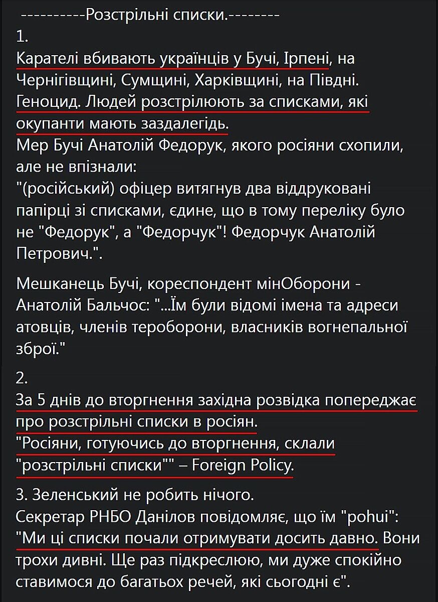 Буча,Ірпінь та інші міста повністю на совісті найвеличнішого.Саме він закликав бути вдома,там надійно.З офісу президента для росіян збирав списки атошників і патріотів Андрій Портнов.За цими списками потім ходили людей розстрілювать кацапи