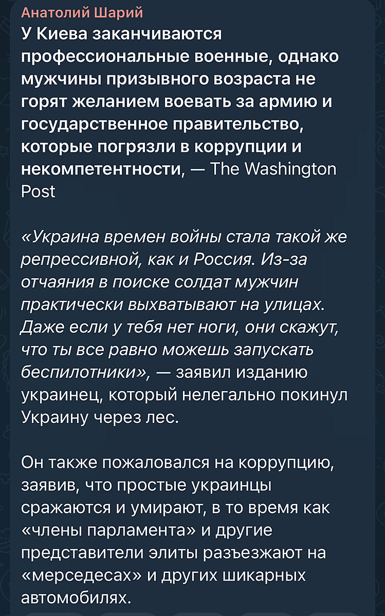 Тут на днях была тема по Шария. Я стала поглядывать. Он публикует какие-то выдержки из западных изданий, без ссылок на первоисточники. Искать, проверять, переводить, нет ни сил ни желания. Но если вдруг это правда, то это очень, очень печально. Это же заливают в уши нашим западным партнёрам🙄