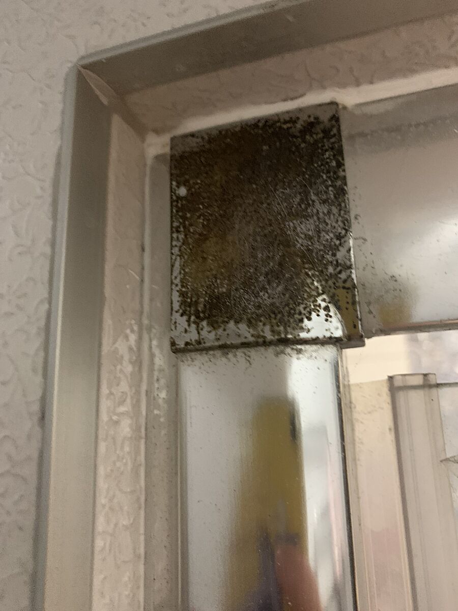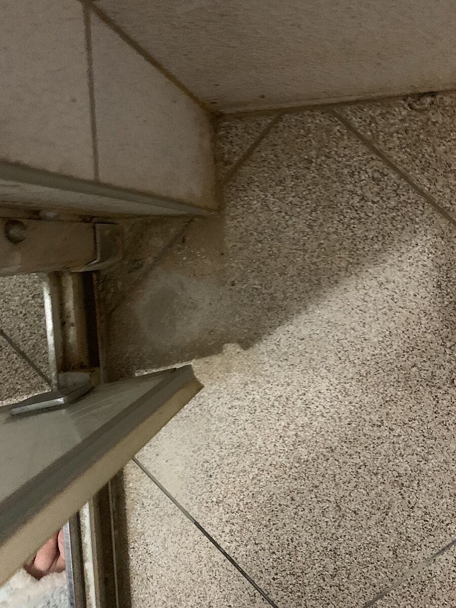 Душова кабіна. Потемніли блискучі елементи на дверях, внизу плитка брудна. Вона шершава, відмивати складно.