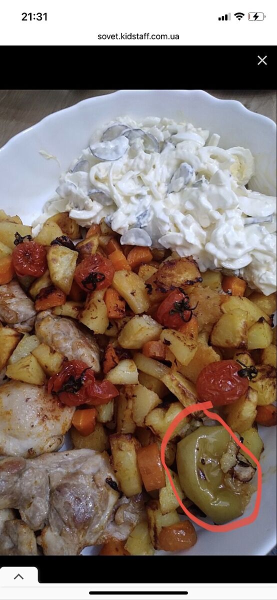 Я вже пару разів на тижні готувала різні варіанти розбірного олів´є-запечена курка, запечені шматочки картоплі і моркви та салат з яєць, цибулі і солоних огірків з майонезом. Собі ще печене яблоко додаю.