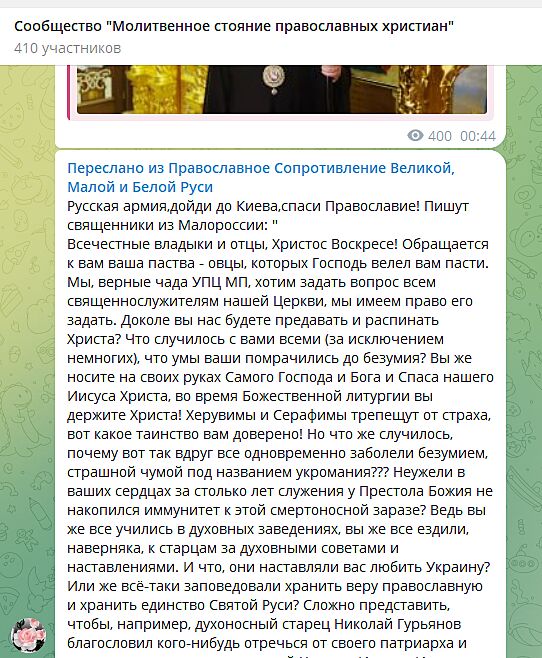 У них ублюдочно- безумная идея - три страны в одной - раша. белораша и Украина. И они все равно выступают за то. что трогают бога. а не фсбшных агентов. поверьте. я ходила в церковь и слушала постоянно о том. что Украина не должна существовать . как самостоятельная единица..