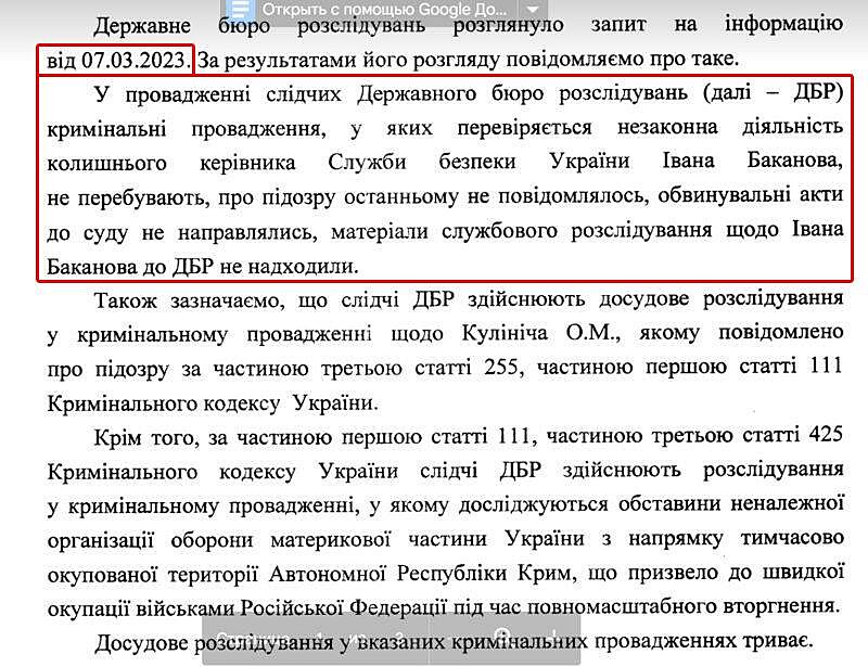 Наразі відомо, що ДБР не розслідує жодної справи щодо колишнього голови СБУ Баканова.