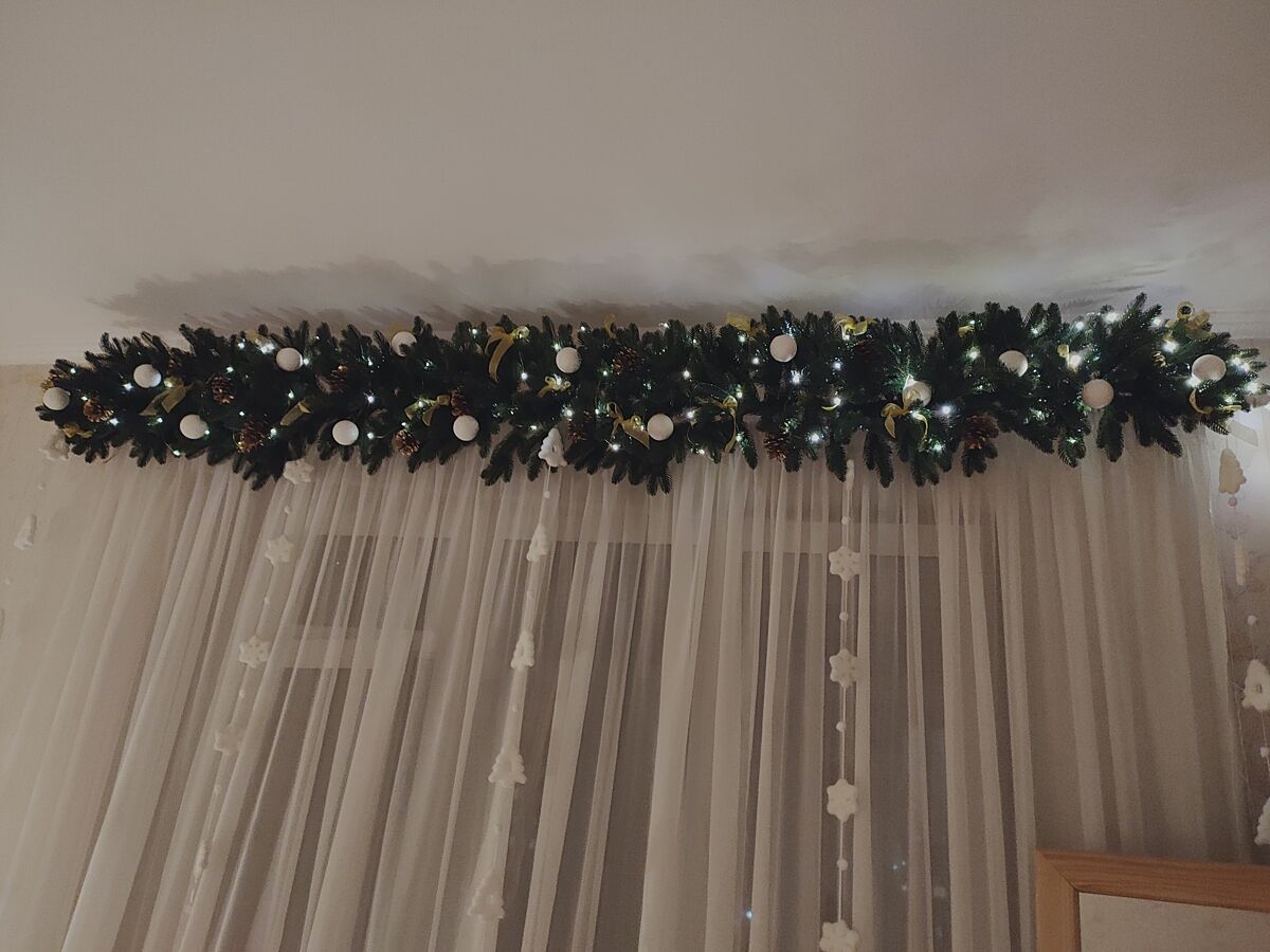 Я на окна купила гирлянды из искусственной елки. Украсила две, ещё две закончу сегодня - только шишки докрасила золотой краской, пусть досохнут немного. Но даже без игрушек они все равно новогоднее настроение создают. Потому что если я его сама себе и своей семье не создам его, оно ниоткуда не возьмётся