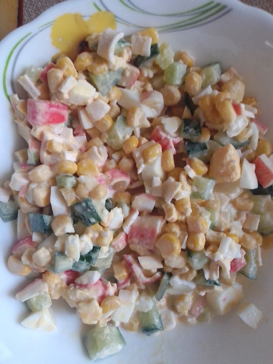 Посмотрела на фото и вспомнила, забыла огурец порезать в крабовый салат 😁, поэтому меня что то смущало...