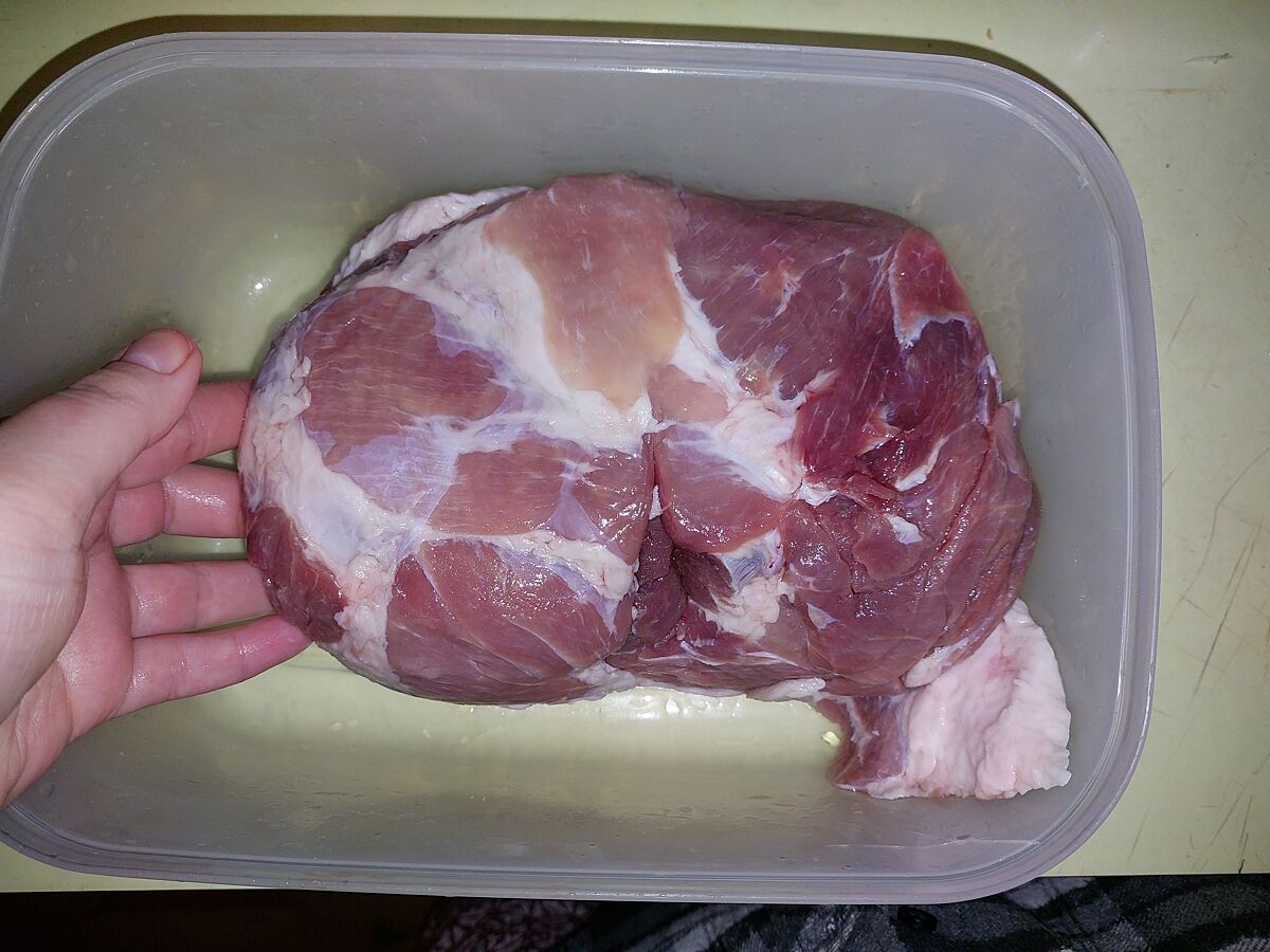 Я такой кусок разрезаю на три плоских части, что бы лучше промариновалось. Соль, перец, Сухой чеснок, лук кольцами. И оставляю на ночь ( в вашем случае, но сколько возможно). Запекаю в рукаве часа два, потом разрезаю и ещё немного до корочки.