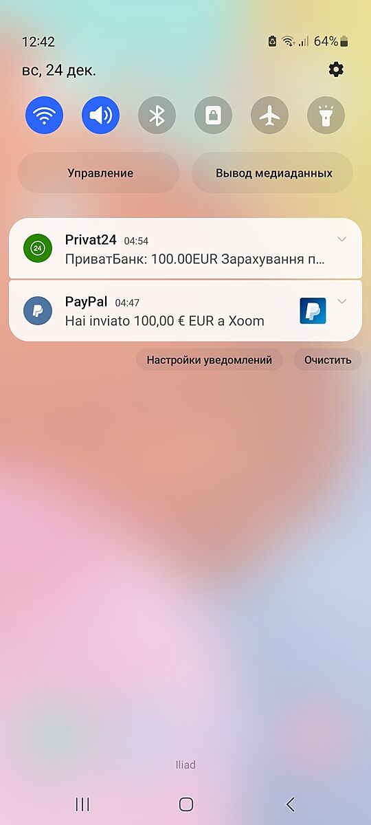 Вот скрин делала. 7 минут от отправки, до зачисления. К пайпалу у меня подключена карточка зарплатная, оттуда прямиком и переводила себе же на приват. Отправила 100, получила тоже 100.