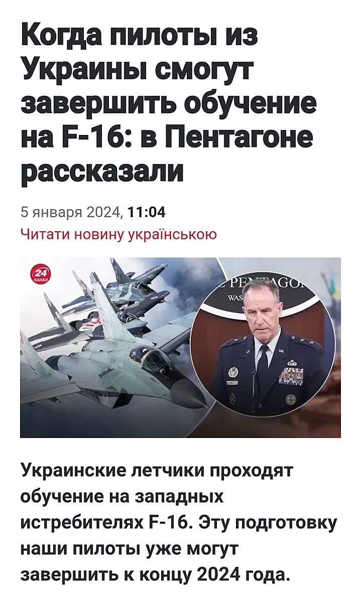 Вчера была новость, что и летчиков на F16 обучат только к концу 2024 года.