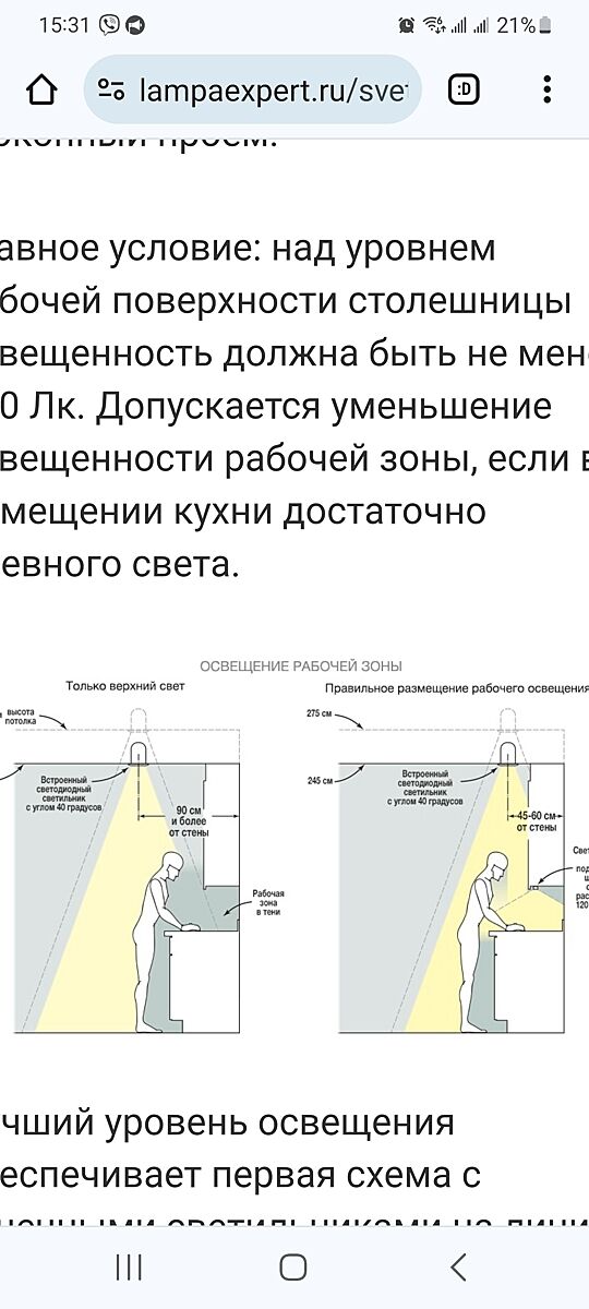 Кухни еще нет и в проекте , делаем потолки и провод для точечных светильников развели на расстоянии 40 см от стены , при условии что верхние шкафы будут 35 см . Рабочие что делают потолки говорят это мало . Мы делали по стандарту с интернета , что б вроде тень не падала от человека на столешницу . Сколько у вас , может кто помнит кто делал такое освещение