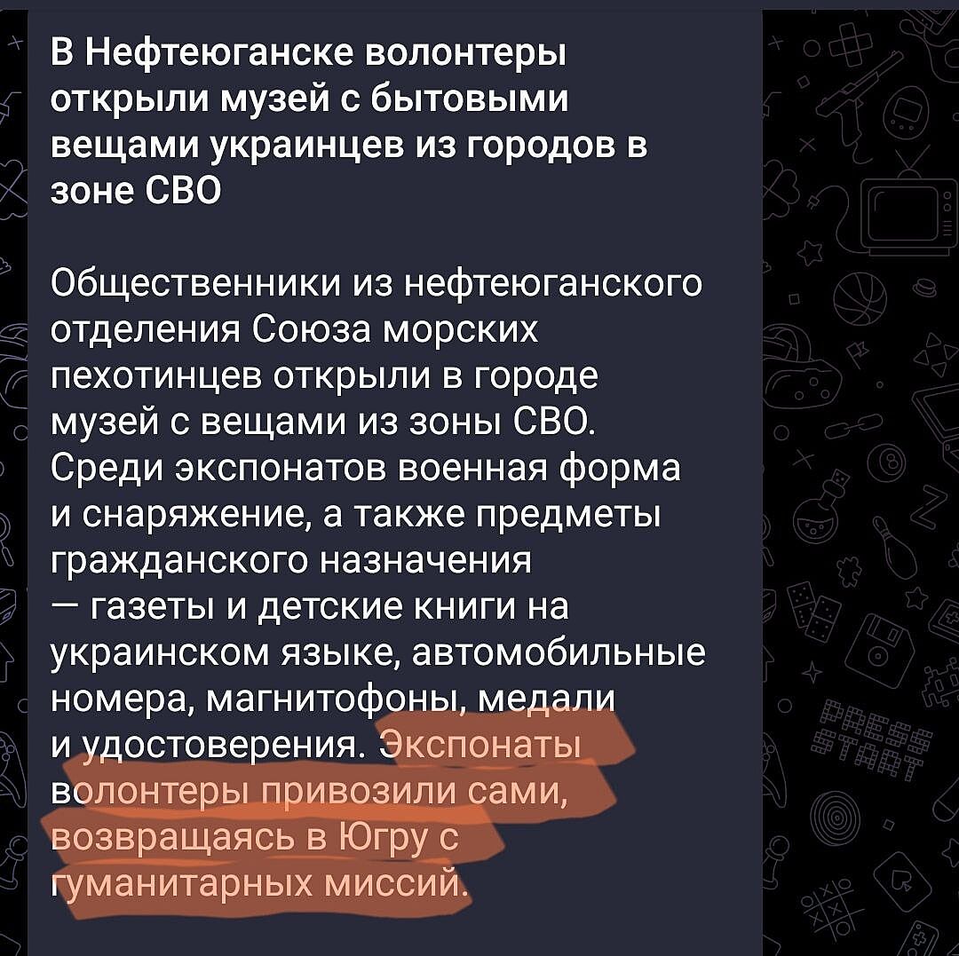 Т.е если раньше только краденые музейные экспонаты из Херсона у себя без стеснения демонстрировали, то сейчас просто гражданские вещи выставляют. В Нефтеюганске волонтеры открыли музей с бытовыми вещами украинцев из городов в зоне СВО. Общественники из нефтеюганского отделения Союза морских пехотинцев открыли в городе музей с вещами из зоны СВО. Среди экспонатов также предметы гражданского назначения — газеты и детские книги на украинском языке, автомобильные номера, магнитофоны, медали и удостоверения.