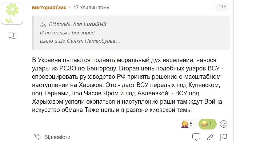 В Украине пытаются поднять моральный дух населения, нанося удары из РСЗО по Белгороду. Вторая цель подобных ударов ВСУ - спровоцировать руководство РФ принять решение о масштабном наступлении на Харьков. Это - даст ВСУ передых под Купянском, под Тернами, под Часов Яром и под Авдеевкой; - ВСУ под Харьковом успели окопаться и наступление раши там ждут Война искусство обмана Таже цель и в разгоне киевской темы